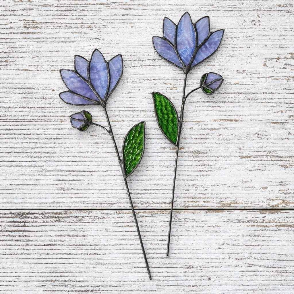 A little garden delight that will last a lifetime. Stained glass blue flowers with bud and stem. Flower and leaf are leaded glass there is no lead on the stem.