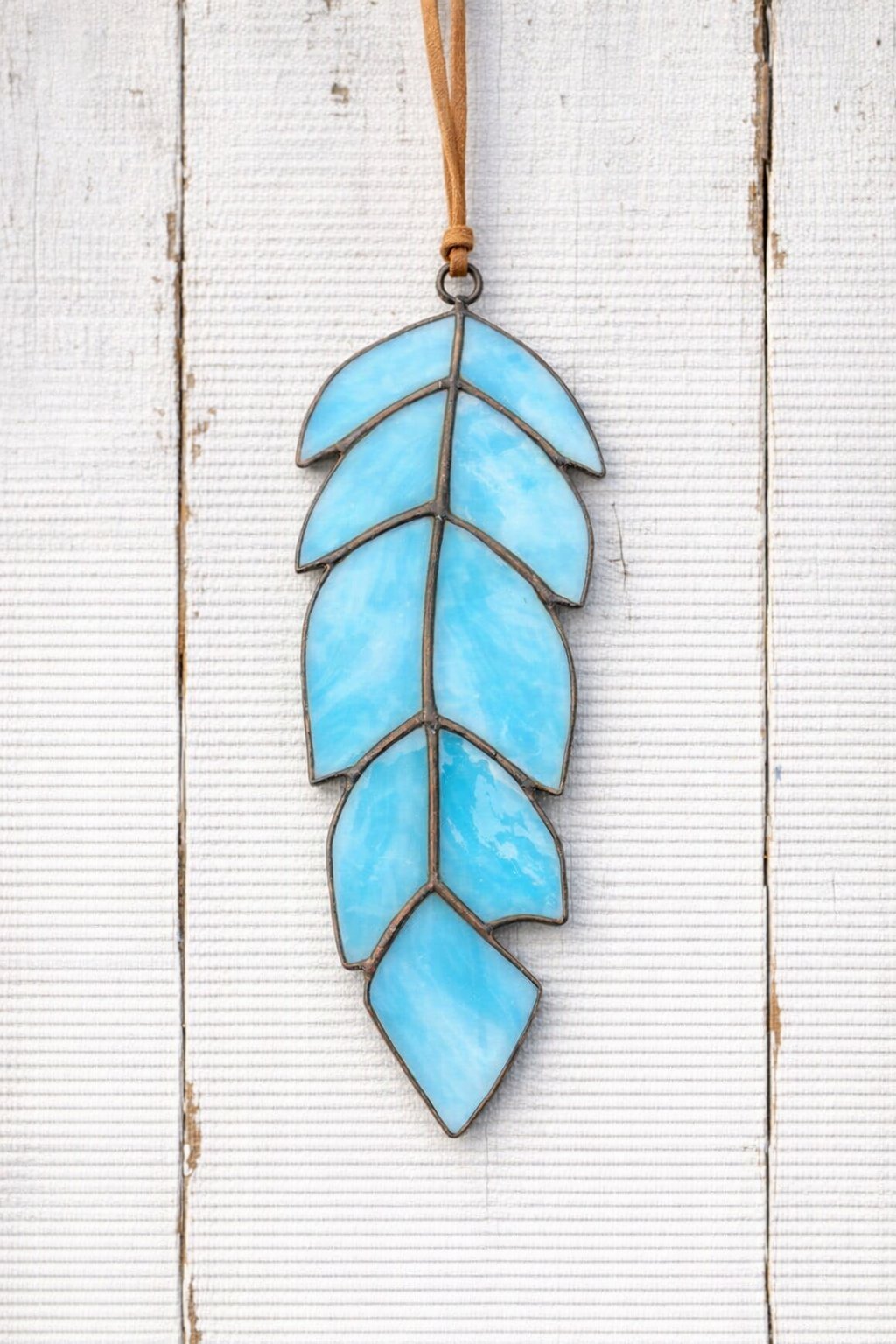 Add a touch of luminous artistry to your space with these handcrafted stained glass feathers. Each piece is meticulously cut, soldered, and finished with a natural leather cord for hanging.